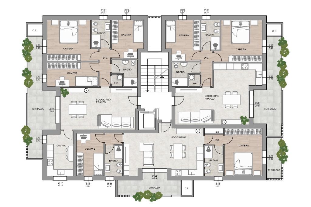 L’appartamento quadrilocale è composto da un’ampia zona giorno con soggiorno e sala da pranzo più cucina separata, la zona notte invece da una camera matrimoniale di 14 mq e due singole entrambe di 12 mq più un ripostiglio posto a ridosso del disimpegno e due bagni con doccia. Dal soggiorno, dalla cucina, dalla camera matrimoniale e da una delle due singole si potrà accedere ad un comodo terrazzo.