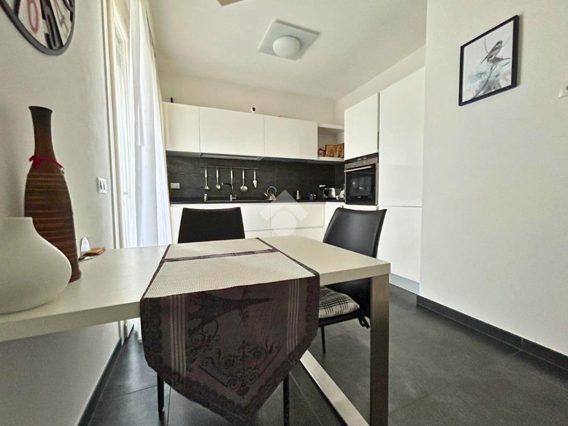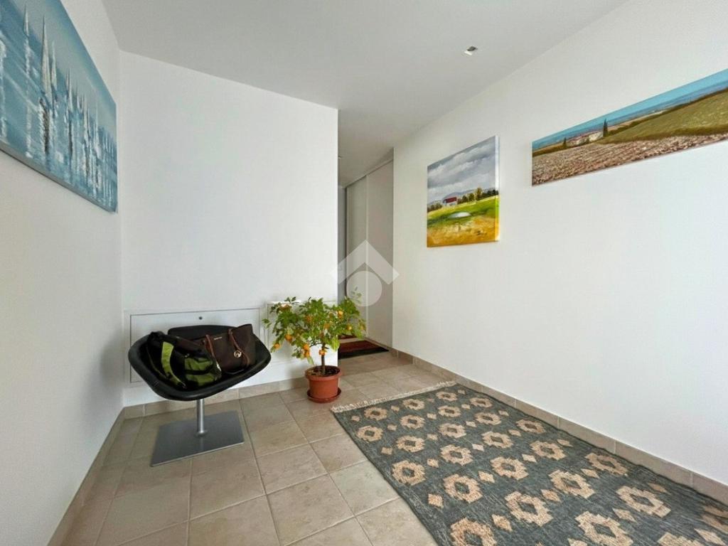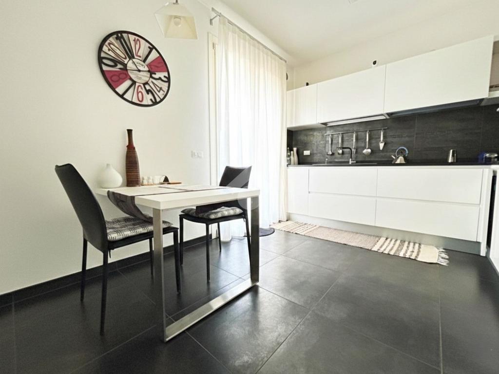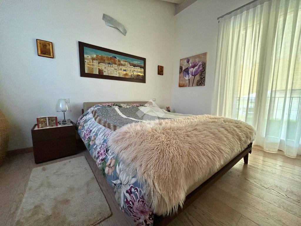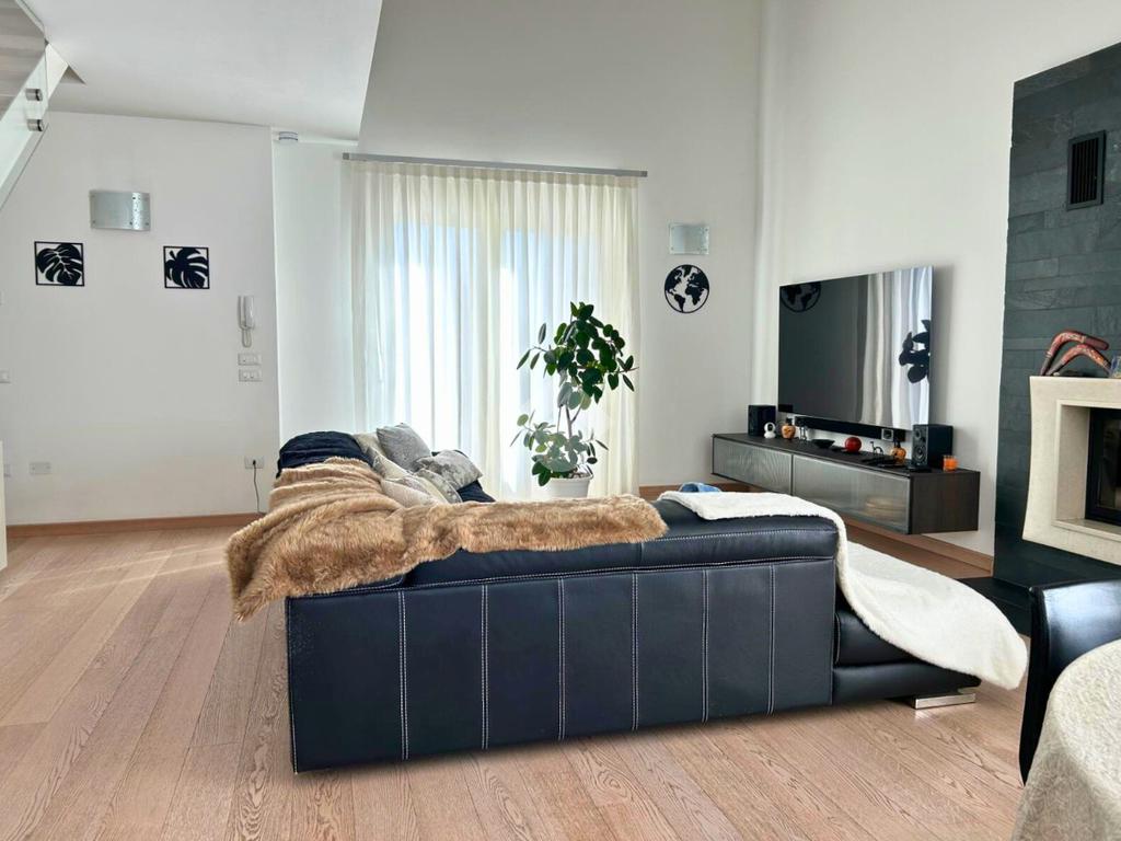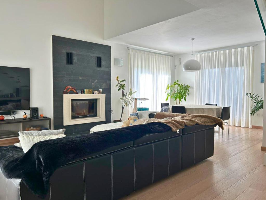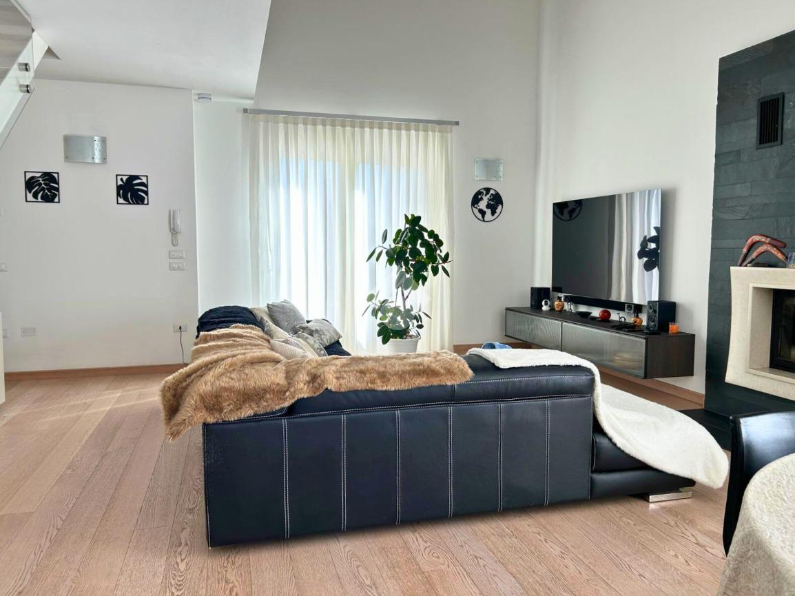Pavimentazione in legno nella zona giorno e nella zona notte, infissi in doppio vetrocamera in legno bianco.