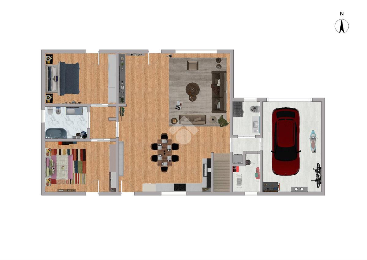 L’immobile è composto al piano terra da un soggiorno di 59 mq, due camere da letto di 14 mq (con possibilità di ricavare la terza camera), due bagni finestrati, garage di 20 mq, portico di 37 mq e scoperto privato di circa 925 mq.