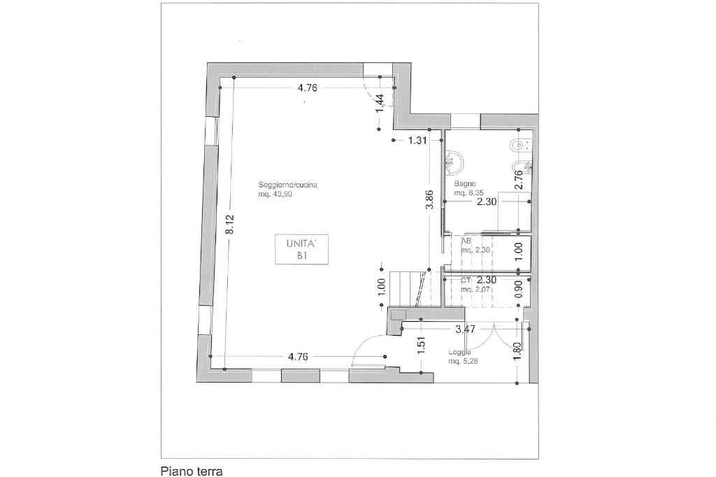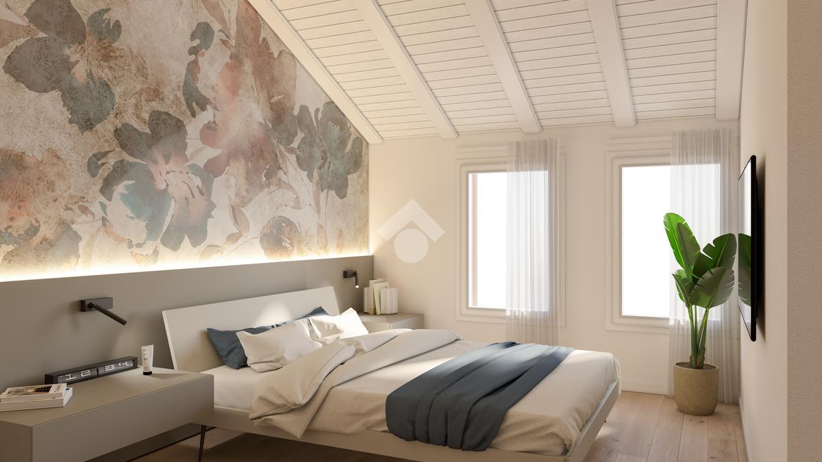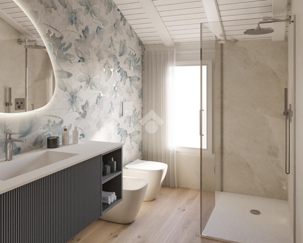 L’abitazione si sviluppa su due livelli. Al piano terra si trova una zona giorno di 44 mq con soggiorno e cucina in open space, antibagno, bagno, locale tecnico e loggia esterna. Al primo piano la zona notte comprende due camere da letto, due bagni e un guardaroba.