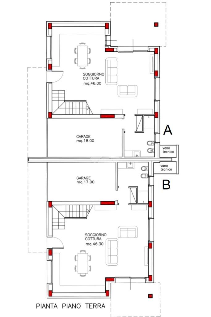 Il piano terra è composto da un’ampia e luminosa zona giorno con soggiorno più cucina in open space di 46 mq più un bagno e accesso diretto al garage di proprietà di 17 mq più il vano tecnico.