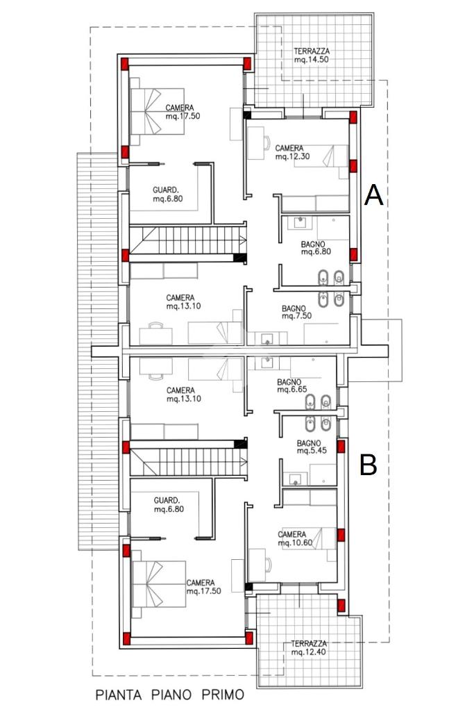 La zona notte è presente al primo piano ed è composta da una spaziosa camera matrimoniale di 17 mq e munita di guardaroba, due camere singole e due bagni finestrati rispettivamente con vasca e doccia. Dalla camera matrimoniale e da una delle due singole si ha accesso ad una terrazza di 12 mq. Completa la soluzione un posto auto scoperto e una porzione di scoperto privato.