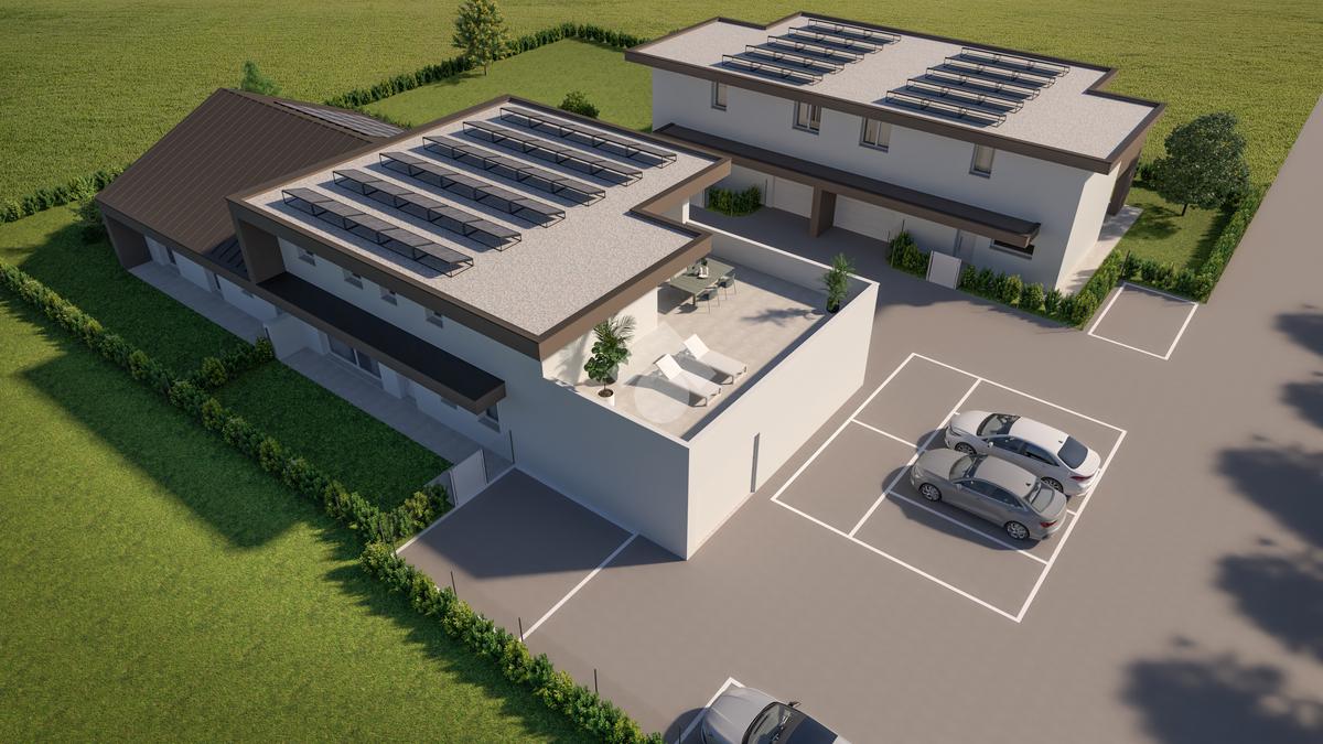 La soluzione sarà dotata di riscaldamento a pavimento, impianto fotovoltaico 3KW, sarà prevista l’installazione di un sistema in pompa di calore, la predisposizione sia di aria condizionata e impianto d’allarme, la muratura esterna verrà rivestita con l’applicazione del cappotto di 14 cm.